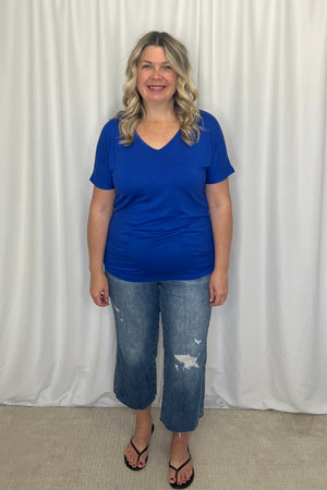 Embrace cozy style with the Chloe Cozy Tee, a perfect basic to add to your patriotic wardrobe. Featuring a v-neckline, longer short sleeves, and a slight dolman style, this relaxed fit top maintains a feminine look, perfect for any day out.