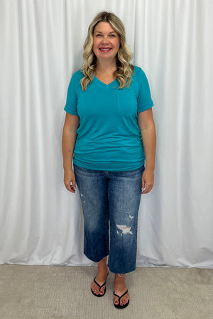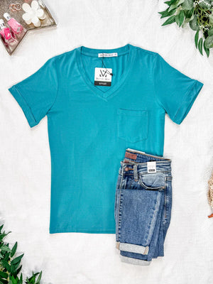 The Sophie Pocket Tee is the ultimate wardrobe essential. This versatile tee features a classic V-neckline, a chic pocket detail, and cuffed sleeves for a touch of casual elegance. Made from buttery soft, high-stretch fabric, it's perfect for layering or wearing on its own. This tee is sure to become your go-to piece for effortless style.