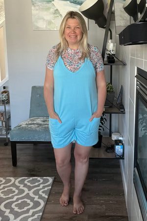 So much fun!! The Shirley & Stone Becky Romper is new for summer in a SHORT style! It features a deep v front, adjustable straps and pockets! It is a relaxed fit made out of lightweight french terry material that has medium stretch. We love it for super comfy loungewear and casual days out!