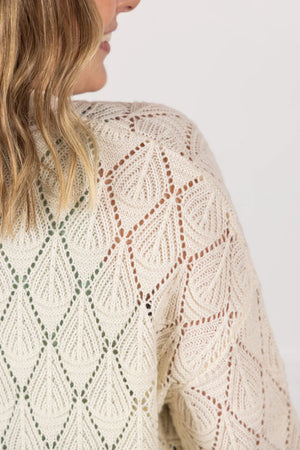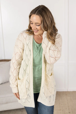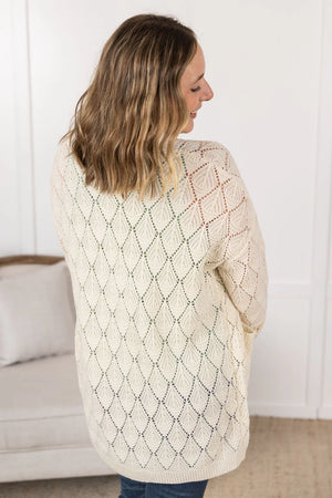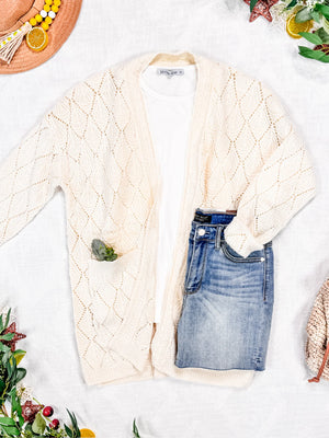 Cozy up in style with our Open Knit Cardigan in Ivory. Made with an open knit design and featuring two convenient pockets, this cardigan is perfect for those chilly days. Stay warm and fashionable with this must-have addition to your wardrobe!