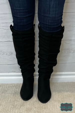 The Aimee Faux Suede Tall Slouchy Boots are a must have!! They have a 1.5" heel with a slocuhy calf style and are made of the softest material!