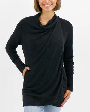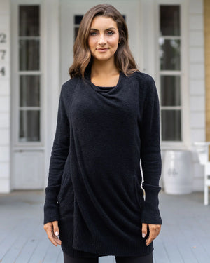 • Functional side pockets with hidden crossover snap closure at the shoulders for "wrap up" with a cowl neckline drape